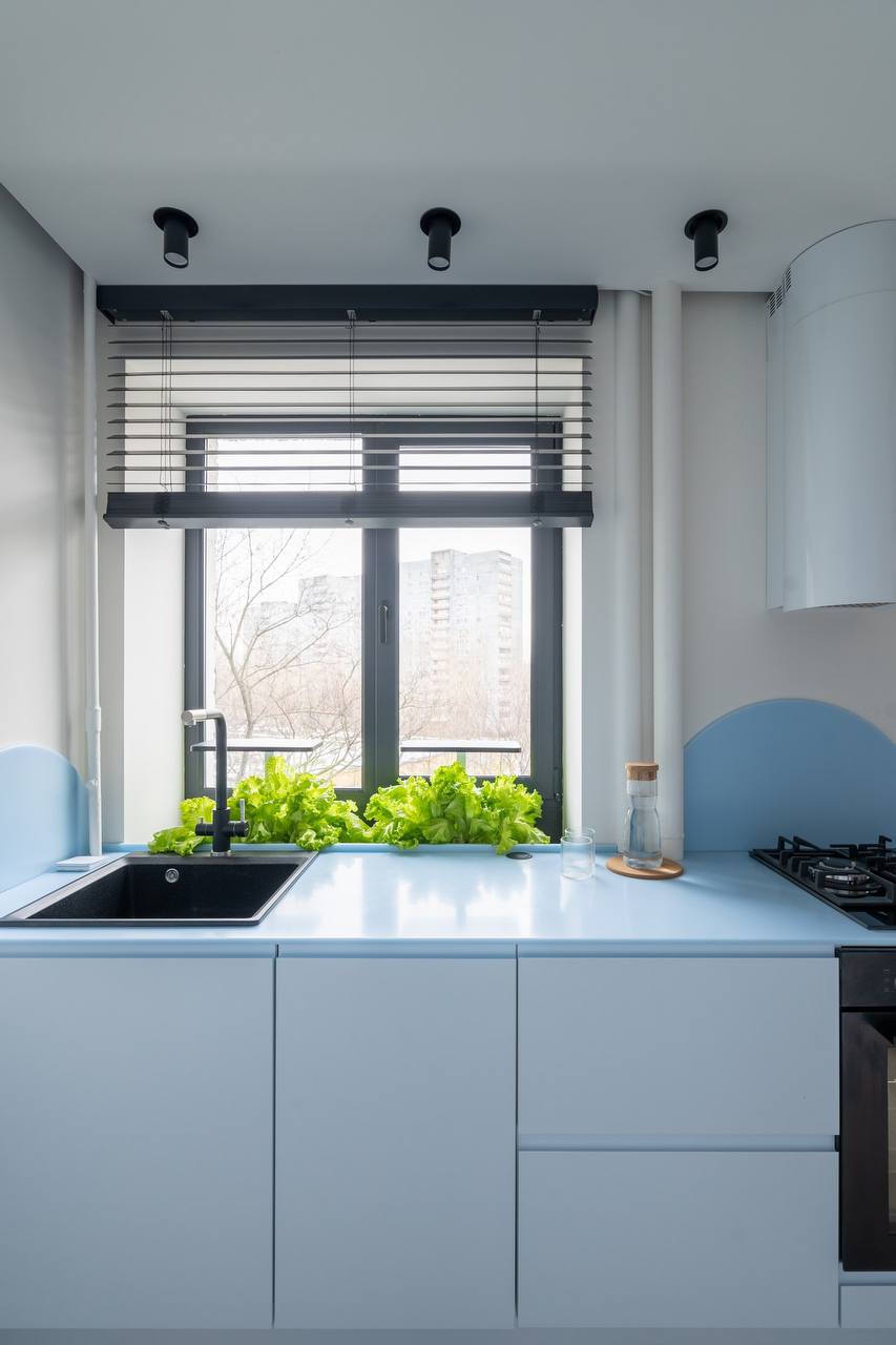 Столешница и фартук выполнены из декора HIMACS Sapphire (S303). Этот небесно-голубой цвет гармонизировал пространство и придал квартире креативную атмосферу.